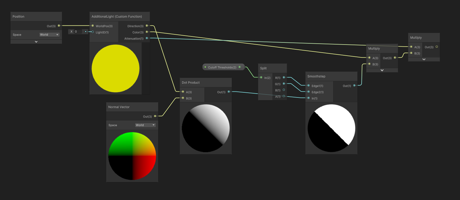 We can use a similar set of nodes here for the lighting calculations as we previously used for the main light. First, I’ll input the world position to my AdditionalLight node and leave the LightID as 0. Then, I’ll take the Dot Product of the AdditionalLight Direction with a Normal Vector node, then Smoothstep the output of this using the Cutoff Thresholds, and then we can multiply that result by the AdditionalLight Color, and then its Attenuation. The only difference here is that we took the ambient light into account in the MainLight calculations, but that only needs doing once.